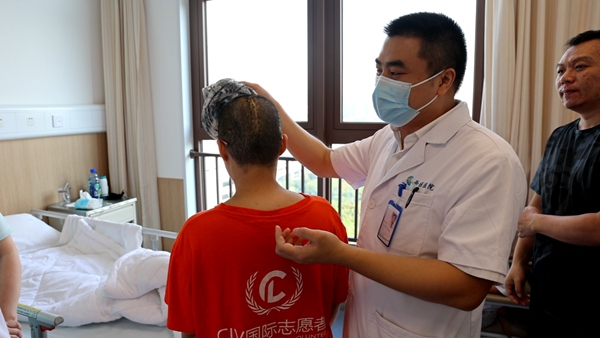 梁鴻查看周女士愈后情況。重慶西區(qū)醫(yī)院供圖