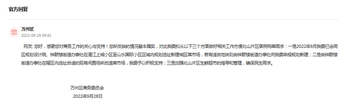 收到留言后,萬州區(qū)商務(wù)委員會針對群眾反映的問題進(jìn)行了核實督辦,回復(fù)稱擬從三個方面做好相關(guān)工作方便北山片區(qū)居民購菜需求: