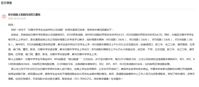 留言后,彭水苗族土家族自治縣交通局馬上核實情況,并與彭水漢葭中學(xué)相關(guān)負責人進行商議,在晚上學(xué)生放學(xué)期間,公交車可開進校門,確保學(xué)生放學(xué)時有車乘坐。