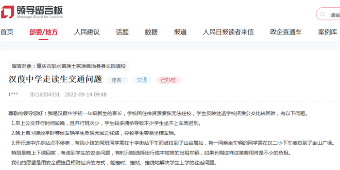 人民網(wǎng)重慶10月13日電 (陳琦)近日,重慶市彭水苗族土家族自治縣一名初一年級新生家長通過人民網(wǎng)“領(lǐng)導(dǎo)留言板”留言反映,學(xué)生往返學(xué)校搭乘公交車比較困難,希望當?shù)赜行Ы鉀Q學(xué)生上學(xué)的往返問題。
