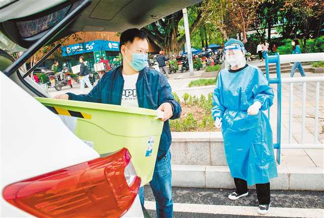 10月12日,江北區(qū)石馬河街道香雪苑社區(qū),同事們主動讓出搬運物資的機(jī)會,讓在核酸篩查點工作的裴妮和負(fù)責(zé)防疫物資轉(zhuǎn)運的丈夫唐世龍見上一面,說上會兒話。