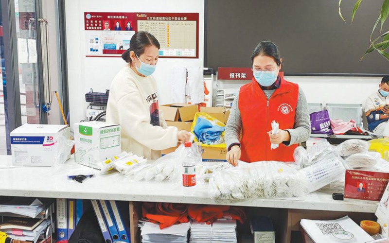 10月13日,江玉霞(左二)在防控點(diǎn)清點(diǎn)整理核酸檢測所需物資。(受訪者供圖)