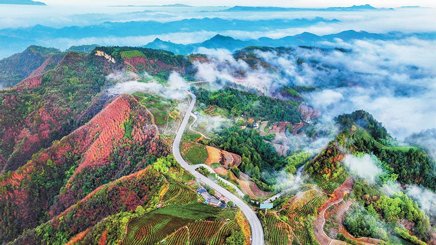 圖為10月22日,萬盛經(jīng)開區(qū)叢林鎮(zhèn)白龍村,云霧繚繞山鄉(xiāng),新修的道路、農(nóng)田與層林盡染的青山相映成趣,美不勝收。