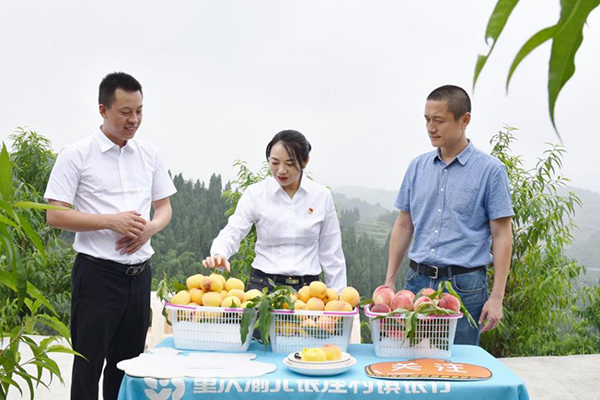 政銀攜手開啟桃樹種植基地“直播秀”。重慶渝北銀座村鎮(zhèn)銀行供圖