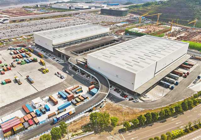 位于果園港國家物流樞紐的中新(重慶)多式聯(lián)運(yùn)示范基地,一期項目集拼倉庫和集裝箱堆場一片繁忙。(攝于2022年4月27日)記者 張錦輝 攝/視覺重慶