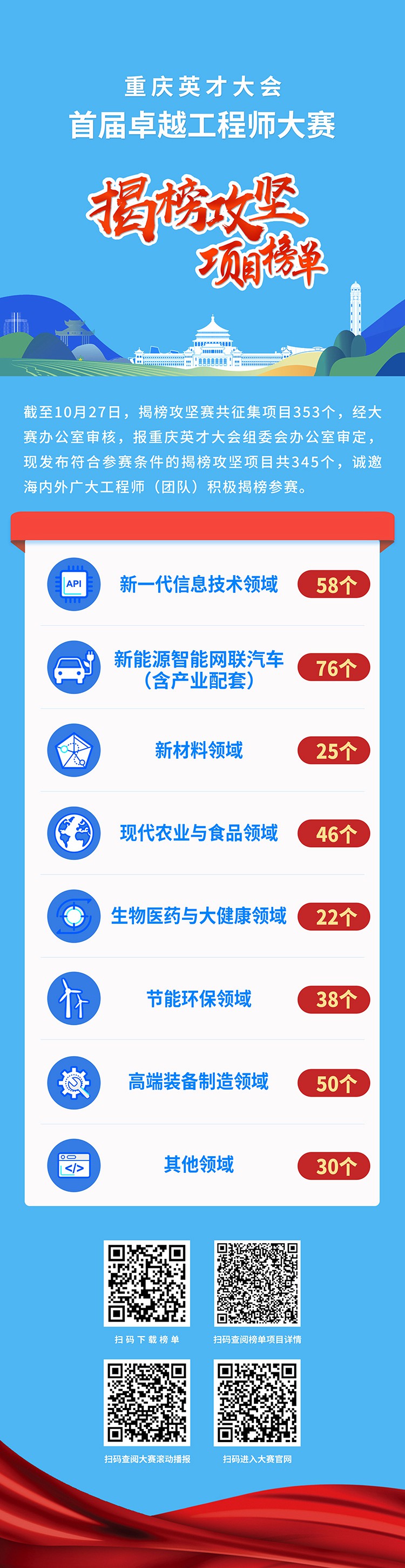 截至10月27日,揭榜攻堅(jiān)賽共征集項(xiàng)目353個(gè),經(jīng)大賽辦公室審核,報(bào)重慶英才大會(huì)組委會(huì)辦公室審定,發(fā)布符合參賽條件的揭榜攻堅(jiān)項(xiàng)目共345個(gè)。