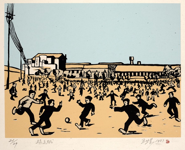 王煒14歲時(shí)創(chuàng)作的處女作《踢足球》 套色木刻 52cm×40cm 1957年