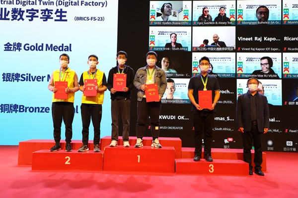 重慶運(yùn)輸職院教師代表隊(duì)奪得2022年金磚國家職業(yè)技能大賽工業(yè)數(shù)字孿生賽項(xiàng)全國一等獎(jiǎng)。重慶運(yùn)輸職院供圖