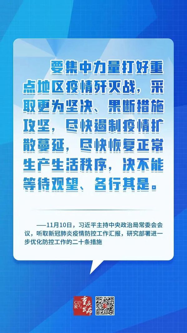 11月10日,習(xí)近平總書(shū)記主持中央政治局常委會(huì)會(huì)議,聽(tīng)取新冠肺炎疫情防控工作匯報(bào),研究部署進(jìn)一步優(yōu)化防控工作的二十條措施,要求集中力量打好重點(diǎn)地區(qū)疫情殲滅戰(zhàn)。