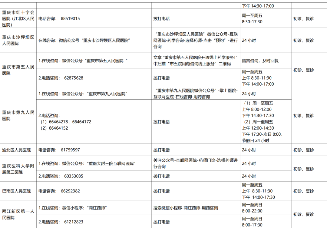 市民可以通過《重慶市中心城區(qū)醫(yī)療機構(gòu)線上藥學(xué)咨詢渠道一覽表》上介紹的方式聯(lián)系醫(yī)院開展咨詢。醫(yī)院官方微信公眾號也將公布具體的操作指南和服務(wù)內(nèi)容。其中部分醫(yī)療機構(gòu)還可以通過互聯(lián)網(wǎng)醫(yī)院開展復(fù)診續(xù)方和藥品配送服務(wù)。
