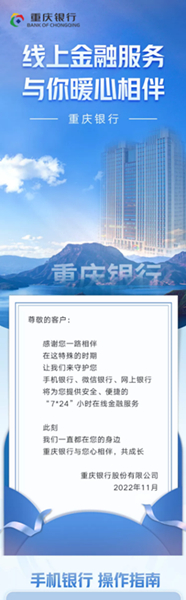 回歸初心,不忘始終。重慶銀行將始終堅持“心相伴,共成長”的客戶服務(wù)理念,堅決扛起疫情防控的社會責(zé)任,持續(xù)優(yōu)化線上服務(wù)渠道,增強(qiáng)客戶線上金融服務(wù)體驗(yàn),全力確保金融服務(wù)“不斷檔”,為廣大人民群眾提供更便捷、更貼心、更優(yōu)質(zhì)的金融服務(wù)。