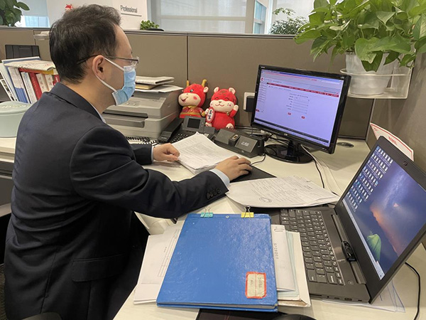 重慶農(nóng)商行總行國(guó)際業(yè)務(wù)部業(yè)務(wù)骨干值守在單位及時(shí)處理業(yè)務(wù)需求。重慶農(nóng)商行供圖