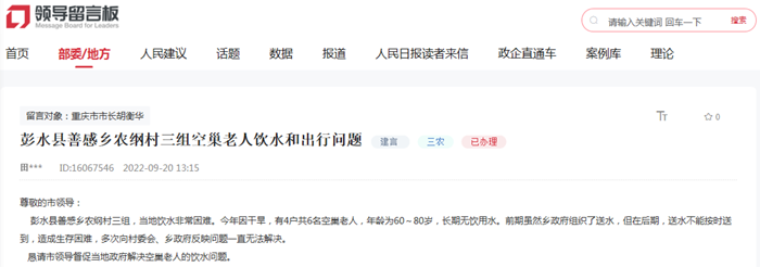 “感謝領(lǐng)導(dǎo)留言板,感謝當(dāng)?shù)卣?,父親和村里老人的用水問題已得到解決?!碧锵壬o人民網(wǎng)重慶頻道反饋。