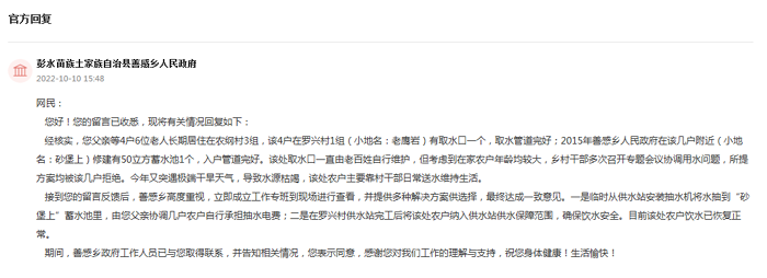 在接到網(wǎng)友留言后,彭水苗族土家族自治縣善感鄉(xiāng)人民政府立刻進(jìn)行實地調(diào)研,并就農(nóng)綱村用水現(xiàn)狀及改善辦法在“領(lǐng)導(dǎo)留言板”上進(jìn)行回復(fù)。