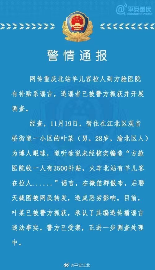 人民網(wǎng)重慶11月22日電 (劉政寧)22日,重慶市公安局江北區(qū)分局發(fā)布警情通報稱:網(wǎng)傳重慶北站羊兒客拉人到方艙醫(yī)院有補(bǔ)貼系謠言,造謠者已被警方抓獲并開展調(diào)查。