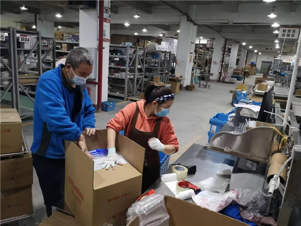 工作人員正在打包一線防疫人員所需物資。歐菲斯供圖