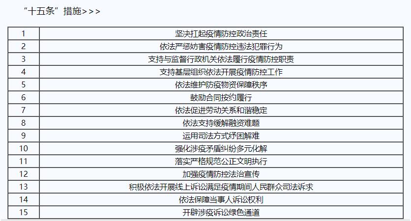 為確保疫情期間“審判執(zhí)行不停擺、公平正義不止步”,有力服務(wù)保障統(tǒng)籌推進(jìn)疫情防控和經(jīng)濟(jì)社會(huì)發(fā)展,日前,市高法院發(fā)布《為堅(jiān)決打好打贏疫情殲滅戰(zhàn)助力經(jīng)濟(jì)社會(huì)健康發(fā)展提供司法保障十五條措施》。