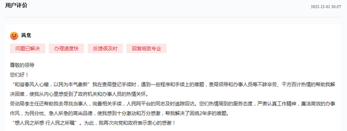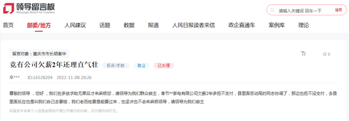 人民網重慶12月5日電 (陳琦)“想人民之所想,行人民之所囑,萬分感激勞動局和人民網平臺的同志幫我解決了困擾2年多的欠薪難題。”近日,重慶奉節(jié)縣一網友在人民網“領導留言板”上給重慶市市長胡衡華留言表達感謝。
