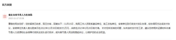 11月17日,重慶市奉節(jié)縣人力社保局回復網友稱:11月15日,經該局協調,安裝單位負責人表示在2022年11月30日前支付喻女士1萬元,并承諾余款在2023年1月20日前付清。