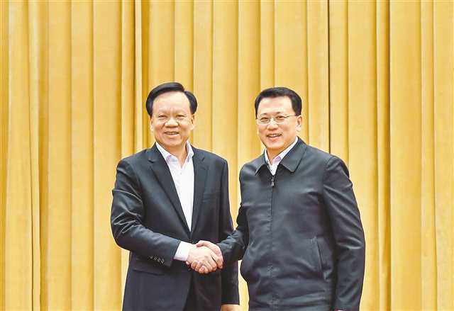 十二月八日,陳敏爾同志和袁家軍同志在全市領導干部會議上親切握手。記者 齊嵐森 攝\視覺重慶