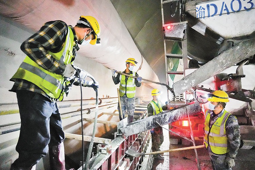 12月11日,萬州長(zhǎng)江二橋北橋頭至高鐵片區(qū)連接道工程現(xiàn)場(chǎng),工人在隧道內(nèi)施工。