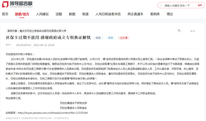 想群眾之所想,急群眾之所急,解群眾之所難。2022年初,百余位退休老人通過人民網(wǎng)“領導留言板”反映,他們從重慶市石柱土家族自治縣退休后,一直隨子女生活居住在成都。因為社保卡過期不能使用,如果都返回石柱辦理社???,對老人而言尤其不方便,想咨詢可否銜接成渝雙城通辦解決?