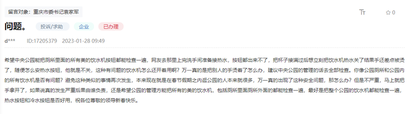 網(wǎng)友在留言中稱,春節(jié)期間和家人去中央公園游玩過程中,上完洗手間準(zhǔn)備接熱水?!鞍粹o都出來不了,杯子接滿水后,不管怎么摁熱水按鈕,它就是不關(guān),手還差點被燙了,這種有問題的飲水機怎么還開著用???萬一真的把別人的手燙著了怎么辦?”對此,該網(wǎng)友建議中央公園把所有飲水機都檢查一遍,避免類似的事情再次發(fā)生。