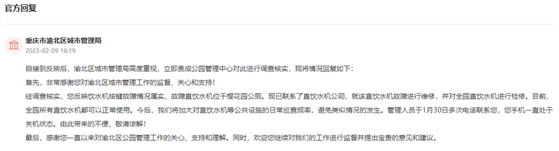 “首先,非常感謝您對渝北區(qū)城市管理工作的監(jiān)督、關(guān)心和支持!經(jīng)調(diào)查核實,您反映飲水機按鍵故障情況屬實,故障直飲水機位于櫻花園公廁。” 回復(fù)中,渝北區(qū)城市管理局相關(guān)工作人員表示,已聯(lián)系了直飲水機公司,就該直飲水機故障進(jìn)行維修,并對全園直飲水機進(jìn)行檢修。目前,全園所有直飲水機都可以正常使用。今后,他們也將加大對直飲水機等公共設(shè)施的日常巡查頻率,避免類似情況的發(fā)生。