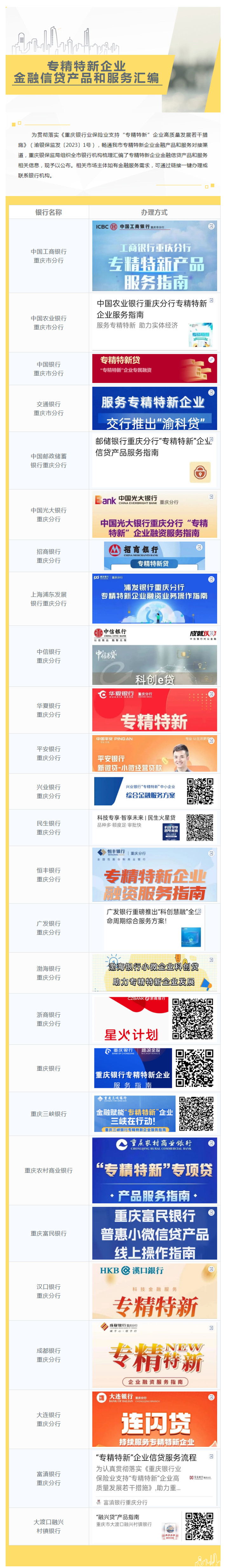 以下為“渝小金”微信公眾號匯編發(fā)布的重慶市銀行機構專精特新企業(yè)金融信貸產品和服務指南: