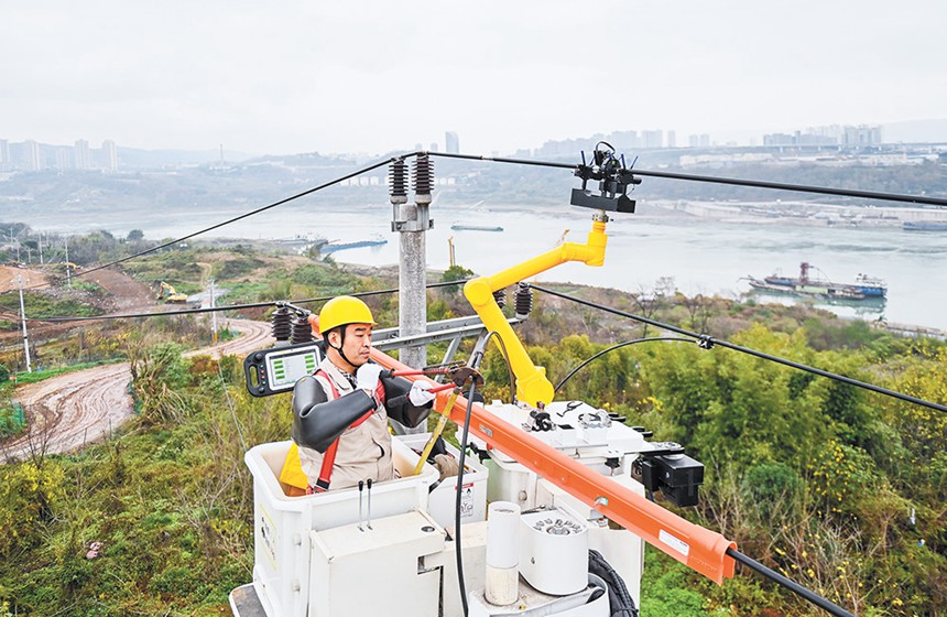 2月14日,南岸區(qū)仰天埡10千伏高革支窯高28號(hào)電桿,工作人員正在操作機(jī)器人進(jìn)行帶電搭頭作業(yè)。