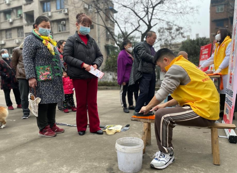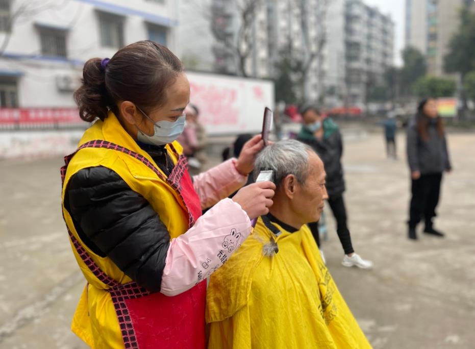 2月20日,大渡口區(qū)躍進(jìn)村街道躍進(jìn)社區(qū)在社區(qū)廣場(chǎng)開張社區(qū)公益集市,轄區(qū)有著理發(fā)、磨刀、修鞋等手藝的居民提供“連心”志愿便民服務(wù),吸引100多名居民參與。
