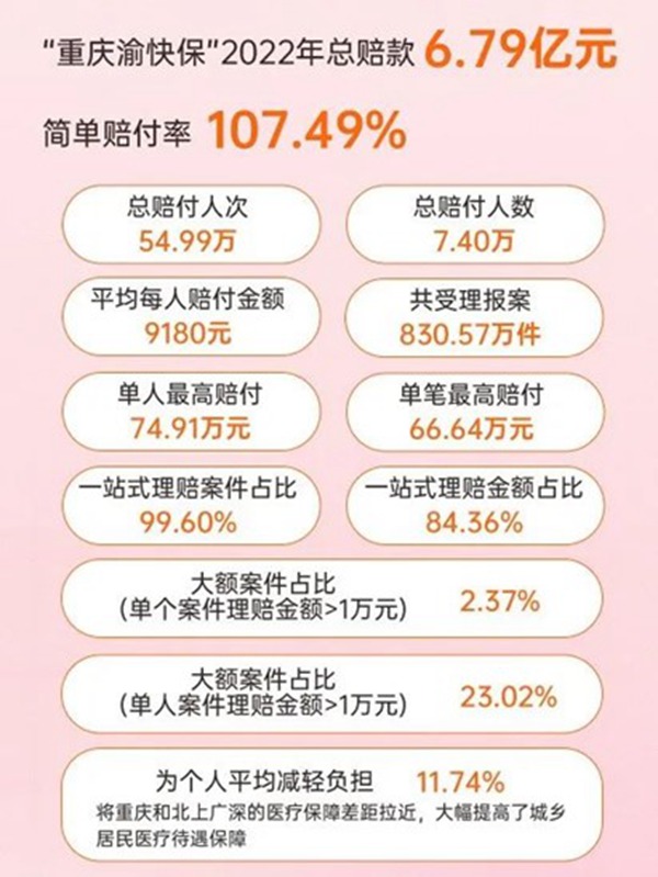 2022年“重慶渝快?!北U鲜啄晟暇€,參保人數(shù)460萬人,總賠款6.79億,總賠付54.99萬人次,簡單賠付率達(dá)107.49%。2023年,“重慶渝快?!睂⒆尦?20萬重慶市民獲得實(shí)惠又實(shí)用的保險(xiǎn)保障,增強(qiáng)家庭抵御醫(yī)療支出風(fēng)險(xiǎn)能力,助力多層次醫(yī)療保障體系建設(shè)。