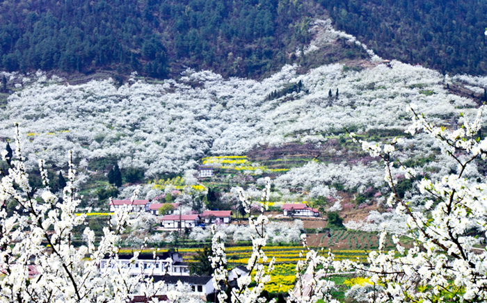 ?印盒李花生態(tài)旅游區(qū)位于渝北區(qū)統(tǒng)景鎮(zhèn)北部,是國家AAA級(jí)景區(qū),內(nèi)有50多年的李樹種植歷史,栽種面積上萬畝,每年三月,李花次第綻放,遠(yuǎn)望如皚皚白雪,近看似凝霜冰花,大有“半山李花滿山雪”之意境。