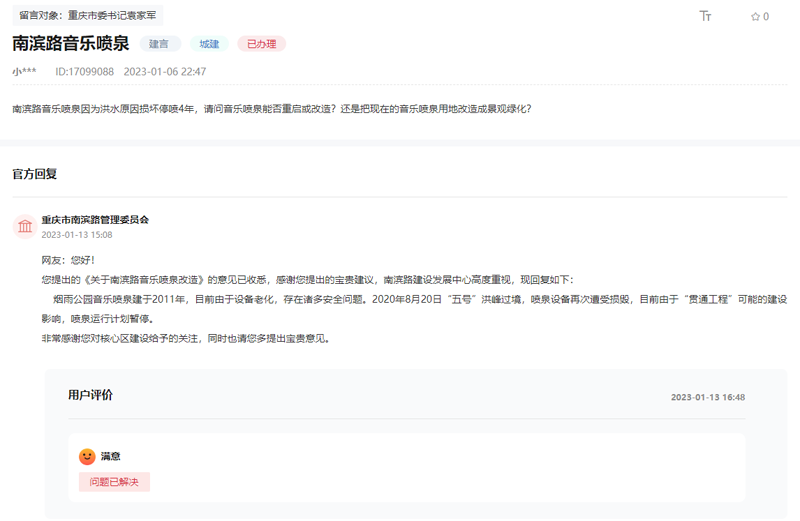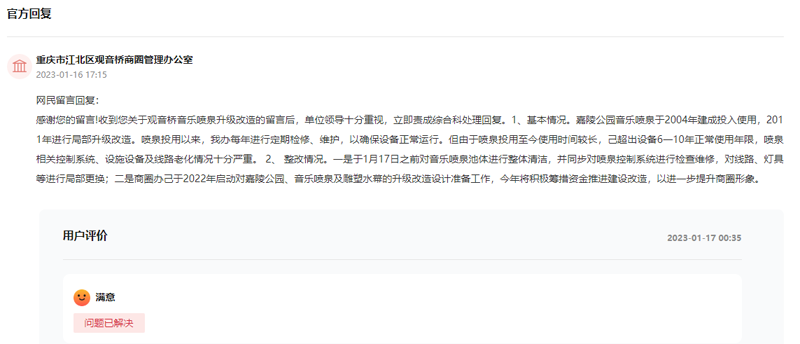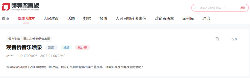 “觀音橋音樂(lè)噴泉于2011年完成升級(jí)改造,如今燈光和水型都出現(xiàn)嚴(yán)重?fù)p壞,請(qǐng)問(wèn)是否有改造的意向?”群眾在領(lǐng)導(dǎo)留言板詢問(wèn)。【留言原文鏈接】