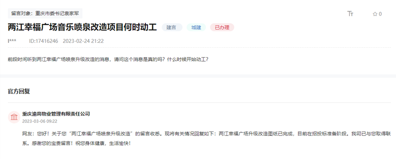 “前段時(shí)間聽到兩江幸福廣場(chǎng)噴泉升級(jí)改造的消息,請(qǐng)問(wèn)這個(gè)消息是真的嗎?什么時(shí)候動(dòng)工?”群眾留言咨詢。【留言原文鏈接】