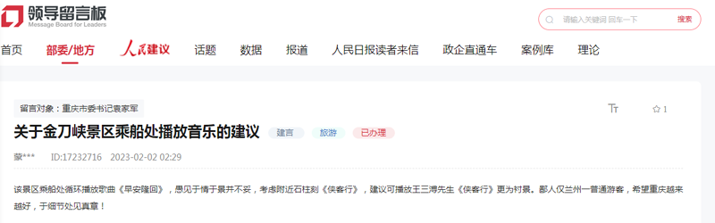 網(wǎng)友在留言中說道,他是來自甘肅蘭州的一位游客,在重慶金刀峽景區(qū)游玩時,景區(qū)乘船處循環(huán)播放流行歌曲《早安隆回》,于情于景并不妥,考慮附近石柱上刻有《俠客行》,建議景區(qū)可播放王三溥先生的《俠客行》更為襯景。并表示希望重慶越來越好,于細節(jié)處見真章!