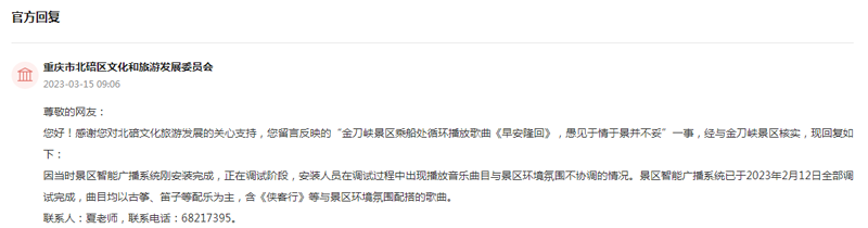 在回復中,北碚區(qū)文旅委首先對游客的建議表達了謝意。并表示當時景區(qū)智能廣播系統(tǒng)剛安裝完成,正處于調(diào)試階段,安裝人員在調(diào)試過程中出現(xiàn)播放音樂曲目與景區(qū)環(huán)境氛圍不協(xié)調(diào)的情況。“目前,景區(qū)智能廣播系統(tǒng)已全部調(diào)試完成,曲目均以古箏、笛子等配樂為主,包括有《俠客行》等與景區(qū)環(huán)境氛圍配搭的歌曲?!?/strong>北碚區(qū)文旅委回應。