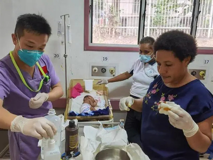 援巴新中國醫(yī)療隊醫(yī)生為當?shù)鼗純褐委?。受訪者供圖