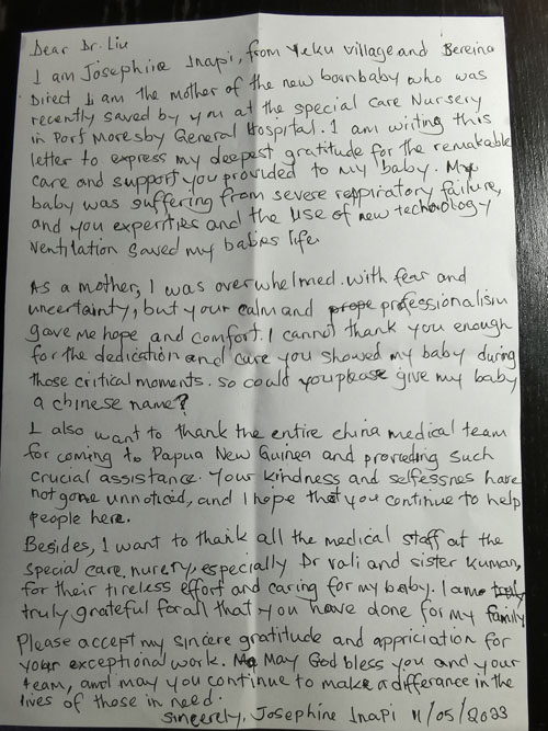 人民網(wǎng)重慶5月18日電 (陳琦、劉祎)“請(qǐng)你給孩子取一個(gè)中國(guó)名字吧!”5月16日,在巴布亞新幾內(nèi)亞莫港總醫(yī)院,援巴布亞新幾內(nèi)亞中國(guó)醫(yī)療隊(duì)(以下簡(jiǎn)稱(chēng)“援巴新醫(yī)療隊(duì)”)副隊(duì)長(zhǎng)、重醫(yī)附屬兒童醫(yī)院新生兒科副主任醫(yī)師劉振球收到當(dāng)?shù)鼐用駟躺?伊奈皮的感謝信,信中,喬瑟菲提出了這樣一個(gè)要求。這是怎么回事?