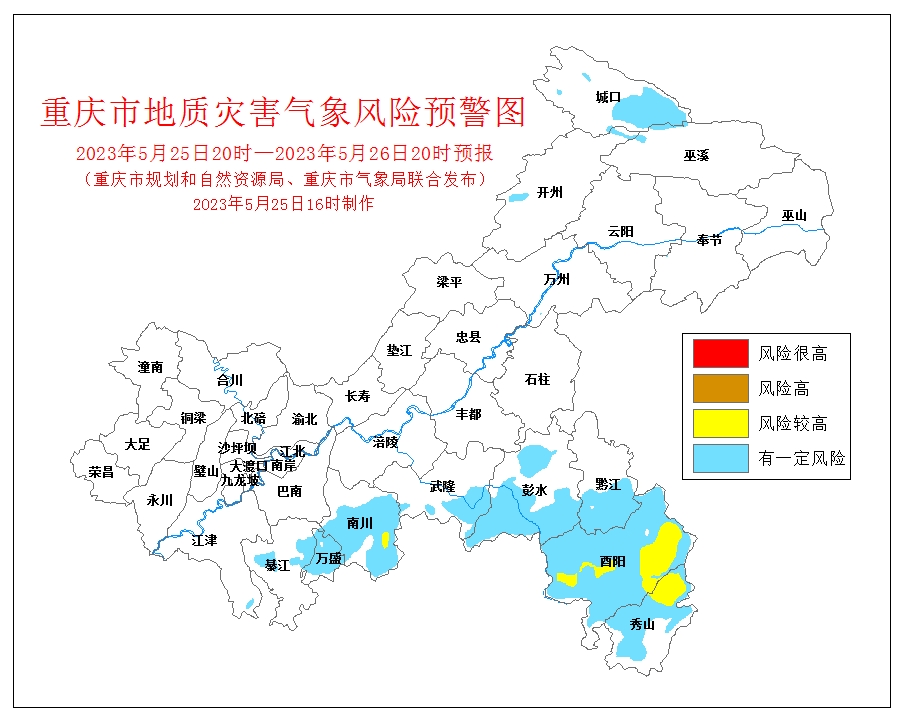 5月25日16時(shí),重慶市規(guī)劃和自然資源局、重慶市氣象局聯(lián)合發(fā)布全市地質(zhì)災(zāi)害氣象風(fēng)險(xiǎn)預(yù)警。