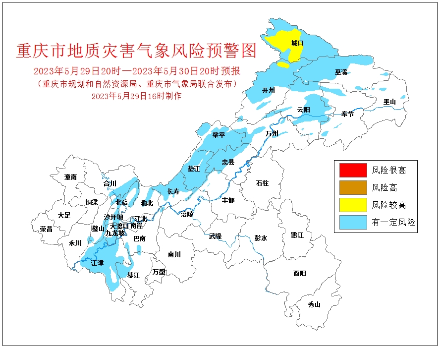 5月29日16時(shí),重慶市規(guī)劃和自然資源局、重慶市氣象局聯(lián)合發(fā)布全市地質(zhì)災(zāi)害氣象風(fēng)險(xiǎn)預(yù)警。