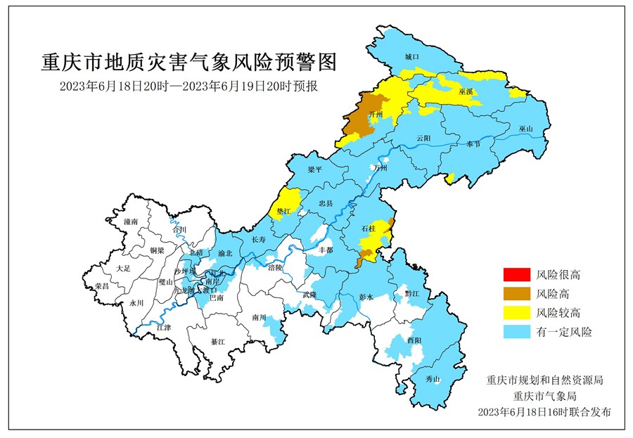 6月18日16時(shí),重慶市規(guī)劃和自然資源局、重慶市氣象局聯(lián)合發(fā)布全市地質(zhì)災(zāi)害氣象風(fēng)險(xiǎn)預(yù)警。