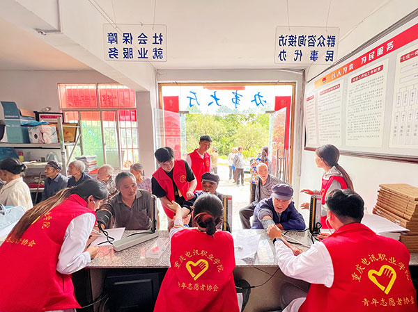 為居民測量血壓、血糖。重慶電訊職業(yè)學(xué)院供圖