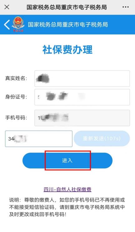 2.在“社保費(fèi)辦理”界面,依次輸入姓名、身份證號、手機(jī)號碼、驗(yàn)證碼等信息后,點(diǎn)擊【進(jìn)入】即可跳轉(zhuǎn)至“社保費(fèi)辦理”頁面。