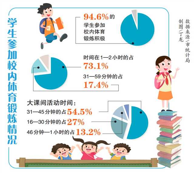 報(bào)告稱(chēng),隨著全市嚴(yán)格落實(shí)學(xué)校體育課程開(kāi)設(shè)要求,體育課程開(kāi)課率、大課間體育活動(dòng)開(kāi)展率、學(xué)校保健操普及率均達(dá)到100%。有94.6%的學(xué)生參加校內(nèi)體育鍛煉積極。學(xué)生參加體育活動(dòng)的時(shí)間在1—2小時(shí)的占73.1%,31—59分鐘的占17.4%。學(xué)校每天安排的大課間活動(dòng)時(shí)間主要在31—45分鐘,占比為54.5%,16—30分鐘的占27%,46分鐘—1小時(shí)的占13.2%。大課間活動(dòng)主要有廣播體操(占90.4%)、眼保健操(占80.2%)、跑步(占86.2%)、跳繩踢毽子(占56.9%)等。