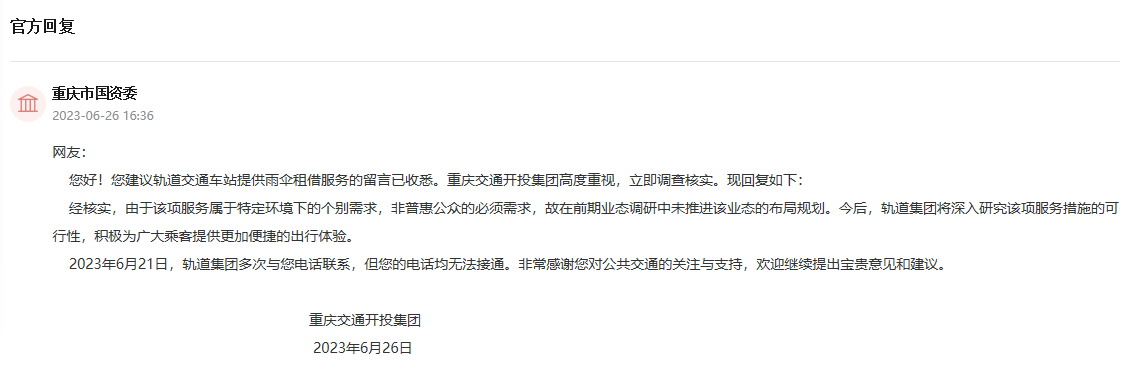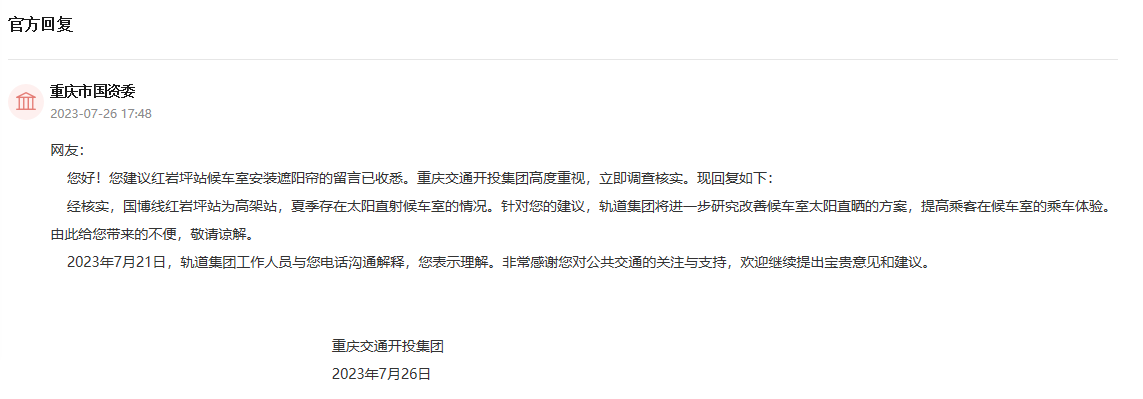 很快,重慶交通開(kāi)投集團(tuán)調(diào)查核實(shí)后,進(jìn)行了回復(fù)。經(jīng)核實(shí),國(guó)博線(xiàn)紅巖坪站為高架站,夏季存在太陽(yáng)直射候車(chē)室的情況。針對(duì)您的建議,軌道集團(tuán)將進(jìn)一步研究改善候車(chē)室太陽(yáng)直曬的方案,提高乘客在候車(chē)室的乘車(chē)體驗(yàn)。
