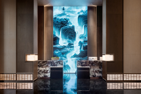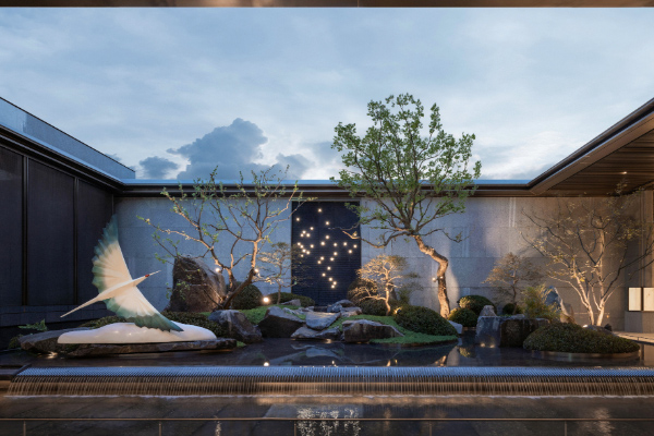 緩步約32米長廊,入畫琉璃水院仰觀6米疊瀑,以石造山,以水?dāng)M池,以國風(fēng)之禮迎賓。此外,示范區(qū)內(nèi)盆景檐口,采用唐代古法制金技藝手工鍛打錘紋,形成108個(gè)精工金屬折邊流水口定制琉璃宮燈,燈影間描摹當(dāng)代奢境。