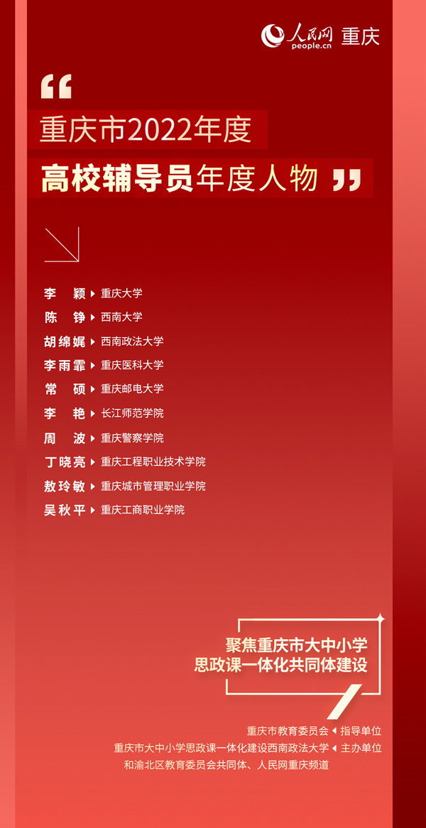 近日,據(jù)重慶市教委消息,經(jīng)學(xué)校申報(bào)、專家評(píng)審,重慶市2022年度高校思想政治工作“年度人物”名單正式公布。
