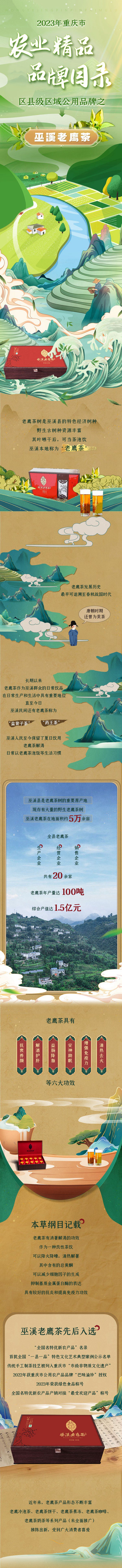 近日,重慶市農(nóng)業(yè)農(nóng)村委發(fā)布《2023重慶農(nóng)業(yè)精品品牌目錄》(以下簡稱《目錄》),經(jīng)過資格審核、專家評審等評選環(huán)節(jié),共有64個品牌入選。本次發(fā)布的《目錄》包含“巴味渝珍”“三峽柑橘”兩個重慶市級區(qū)域公用品牌,萬州玫瑰香橙、涪陵榨菜、趕水草蔸蘿卜、放牛坪梨等28個區(qū)縣級區(qū)域公用品牌,樹上鮮花椒油、魚泉榨菜、井谷元重慶二兩小面、陳昌銀麻花等34個企業(yè)產(chǎn)品品牌,集中呈現(xiàn)了重慶市農(nóng)業(yè)品牌建設的豐碩成果。本文將帶你詳細了解入選《目錄》區(qū)縣級區(qū)域公用品牌的巫溪老鷹茶。