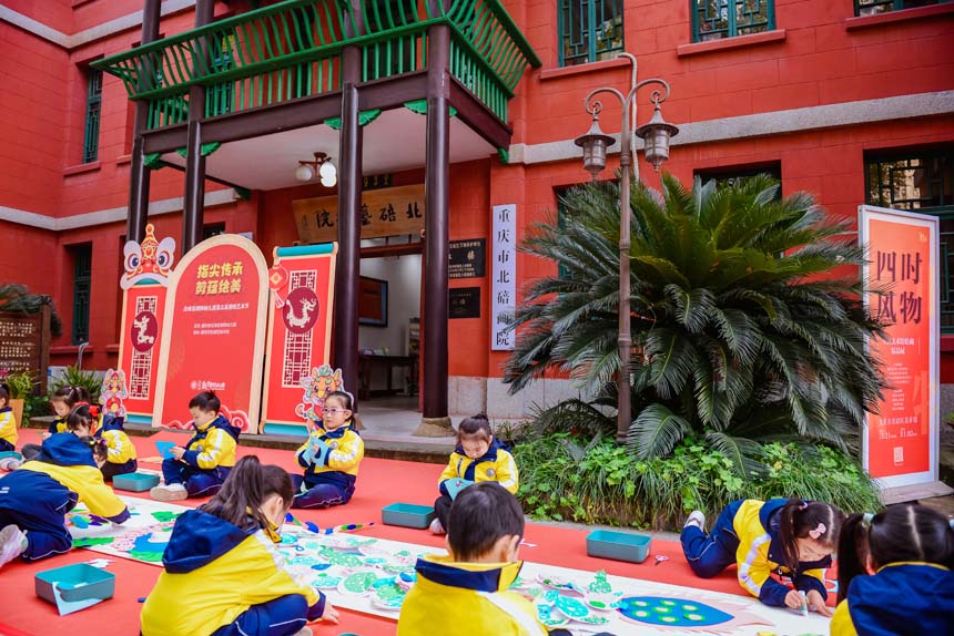 在全國(guó)文物保護(hù)單位——北碚美術(shù)館舉行的剪紙藝術(shù)展上,一把剪刀,一張剪紙,“咔嚓,咔嚓”,稚嫩的小手在紙上飛舞。百米長(zhǎng)卷上,孩子們揮筆勾勒,妙剪生花?;蛩?、或剪、或拼貼,一條條活靈活現(xiàn)的“五心”中國(guó)龍躍然紙上,迎接著龍年的到來(lái)?!氨表占艏垺钡谌鷤鞒腥肆核刂笇?dǎo)孩子們進(jìn)行剪紙創(chuàng)作,共享剪紙之樂(lè)。